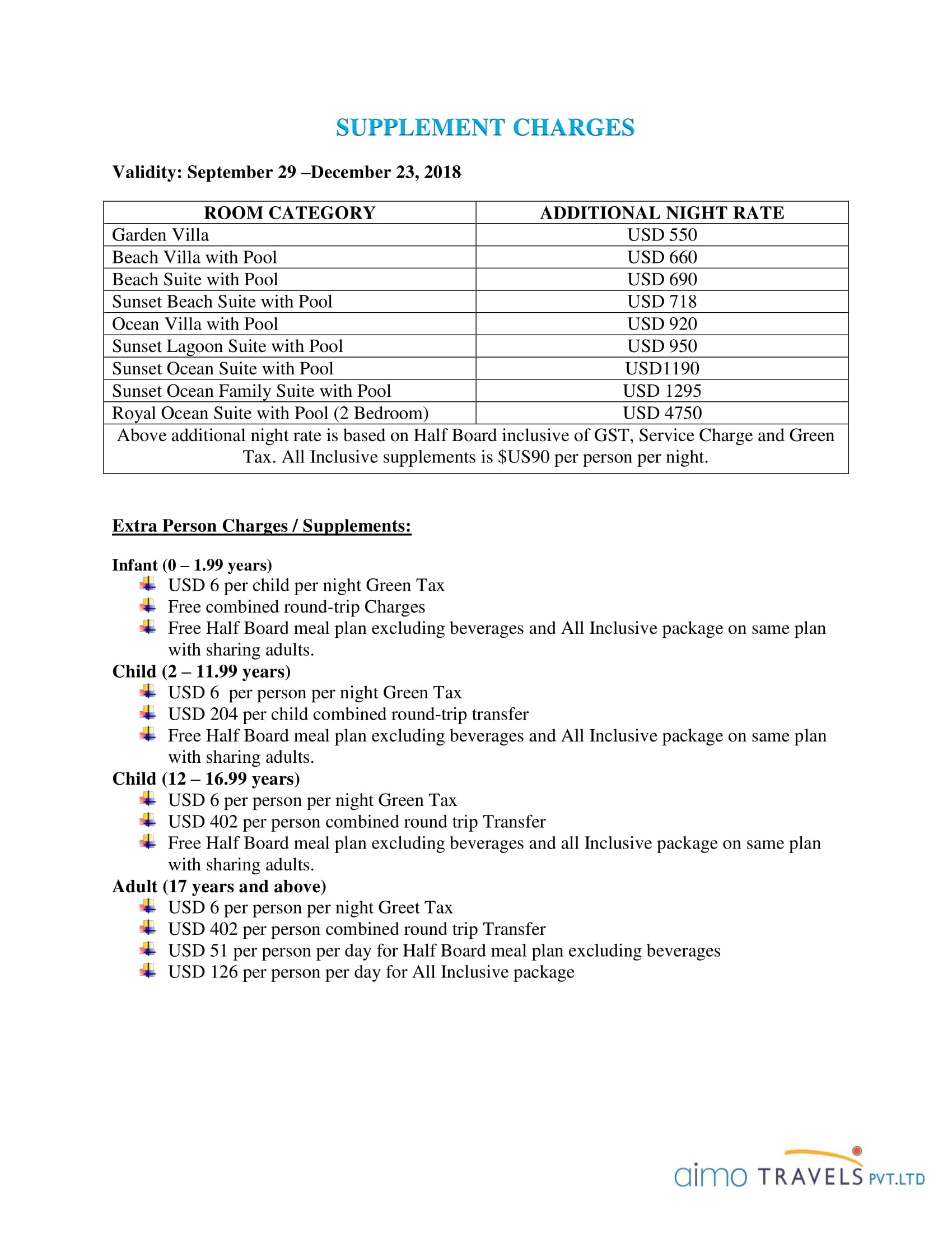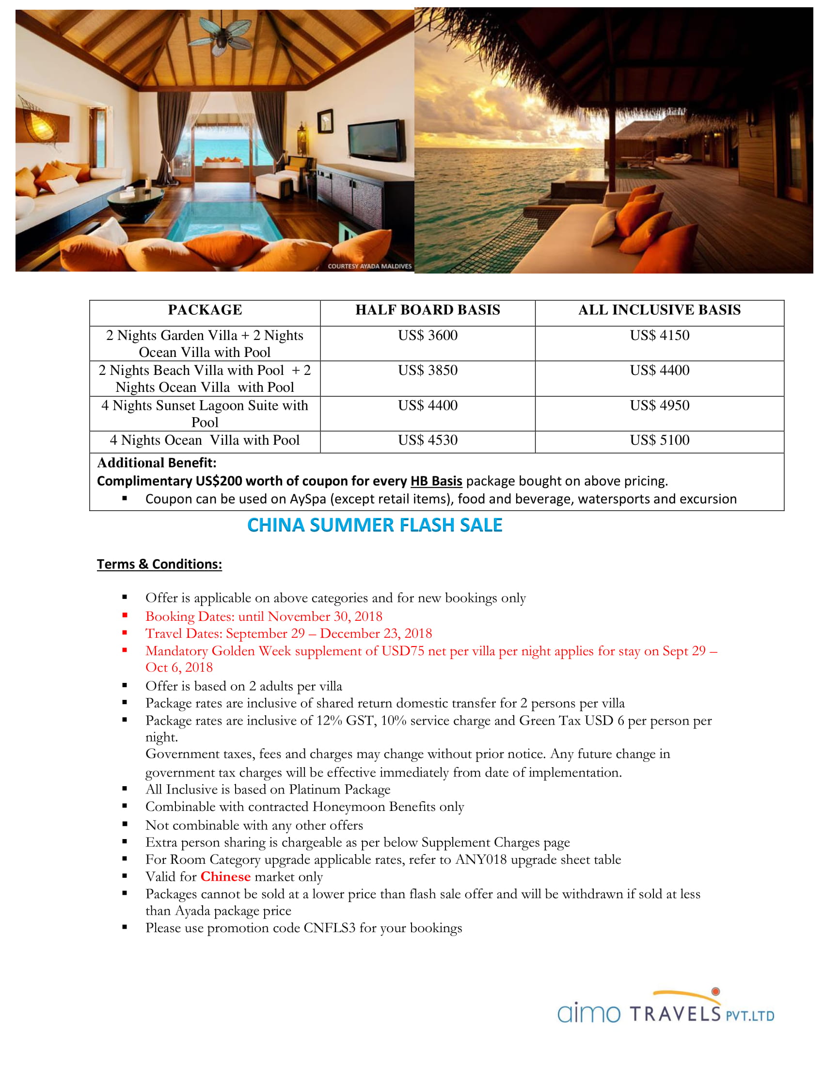 Terms & Conditions:  Offer is applicable on above categories and for new bookings only  Booking Dates: until November 30, 2018  Travel Dates: September 29 – December 23, 2018  Mandatory Golden Week supplement of USD75 net per villa per night applies for stay on Sept 29 – Oct 6, 2018  Offer is based on 2 adults per villa   Package rates are inclusive of shared return domestic transfer for 2 persons per villa  Package rates are inclusive of 12% GST, 10% service charge and Green Tax USD 6 per person per night. Government taxes, fees and charges may change without prior notice. Any future change in government tax charges will be effective immediately from date of implementation.   All Inclusive is based on Platinum Package  Combinable with contracted Honeymoon Benefits only  Not combinable with any other offers   Extra person sharing is chargeable as per below Supplement Charges page  For Room Category upgrade applicable rates, refer to ANY018 upgrade sheet table  Valid for Chinese market only  Packages cannot be sold at a lower price than flash sale offer and will be withdrawn if sold at less than Ayada package price  Please use promotion code CNFLS3 for your bookings