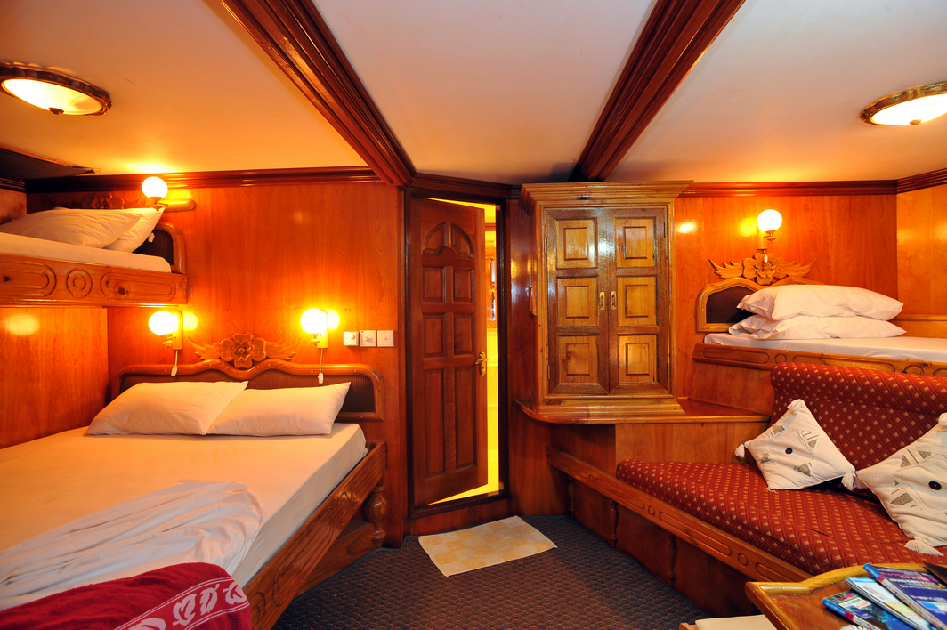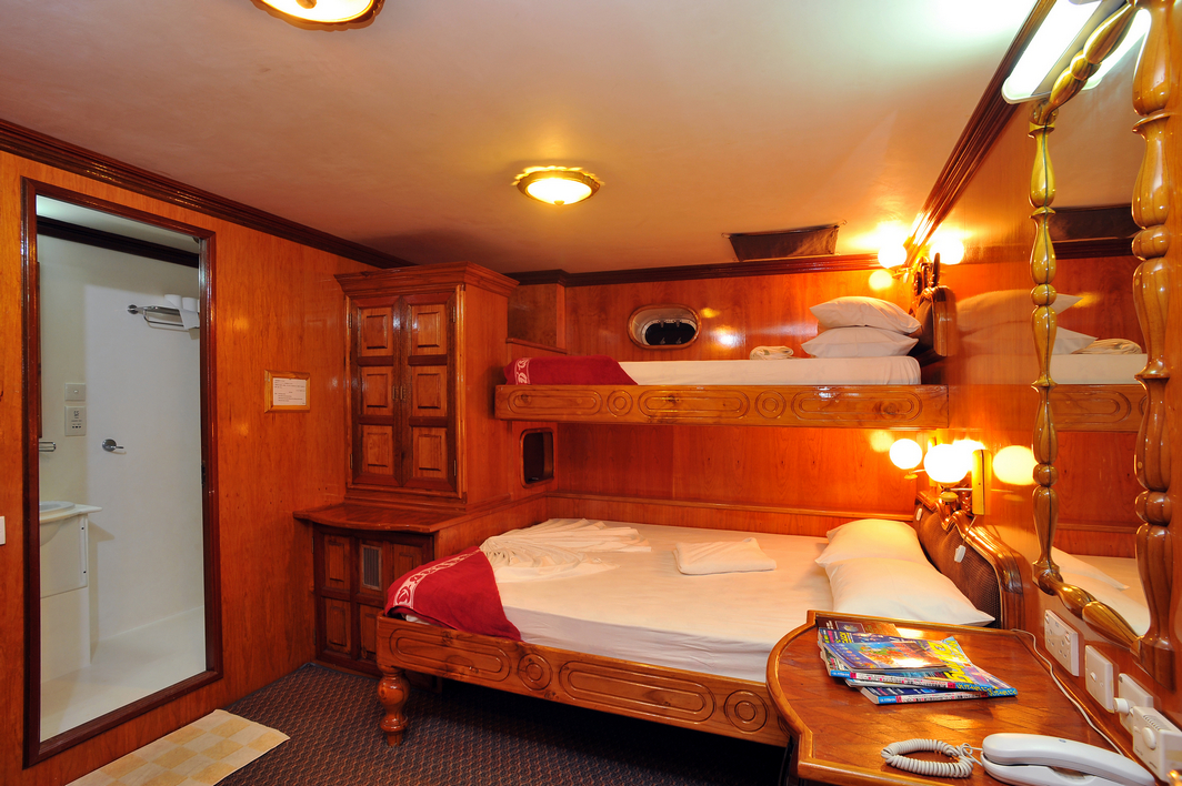 All rooms have stylish top quality fixtures and fittings with elegant wooden wardrobes, mirrors, lighting, a lockable fridge, air conditioning and cabin-to-cabin telephones. All cabins have en-suite bathrooms with flush toilets, hot and cold water and glass-door shower cubicles.