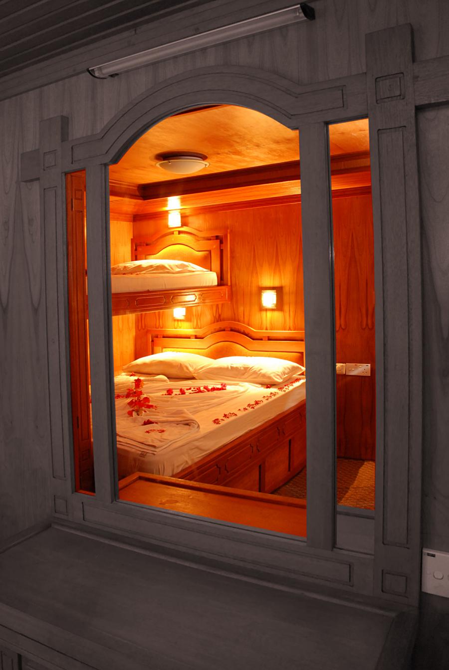 All rooms have stylish top quality fixtures and fittings with elegant wooden wardrobes, mirrors, lighting,a lockable fridge, air conditioning and cabin-to-cabin telephones. All cabins have en-suite bathrooms with flush toilets, hot and cold water and glass-door shower cubicles.