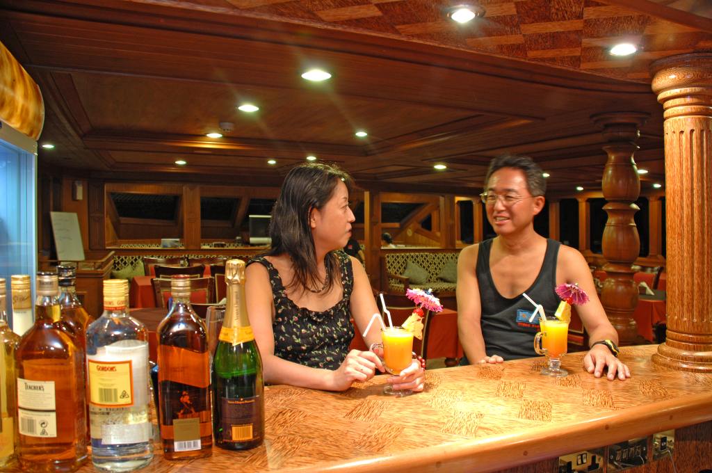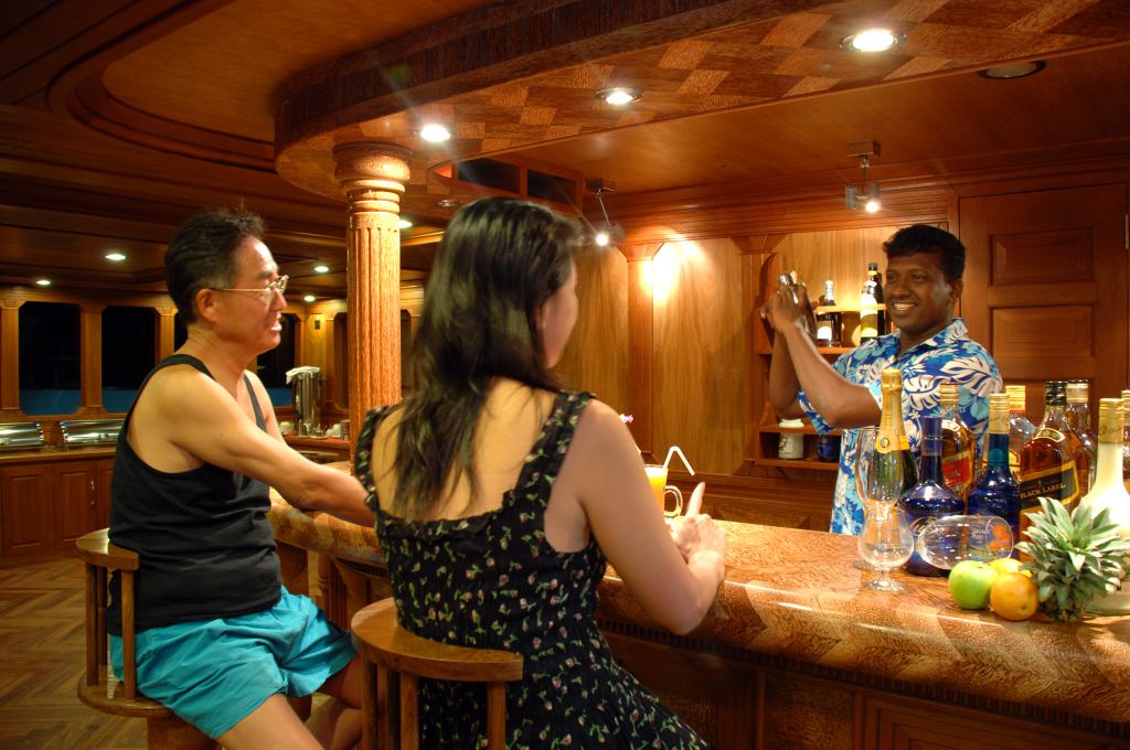 The main deck features a well-stocked bar serving international brands of alcohol, soft drinks, teas, coffees, espressos, cappuccinos and light snacks. Please note that if a particular drink is not on board you may place a request with the barman who will do his best to provide it for you.